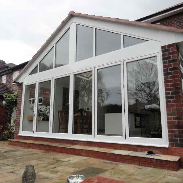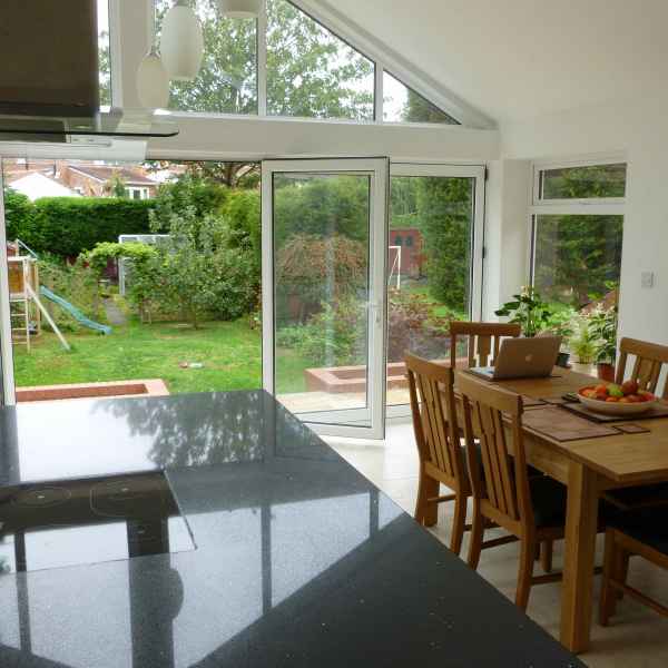 A steel frame gable as incorporated into the rear element. This enabled a fully glazed elevation with folding/sliding doors opening out to the rear garden. The full height ceiling enhances the sense of space and allows daylight to flood every part of the room. An underfloor heating system was used to maintain the open plan kitchen design.